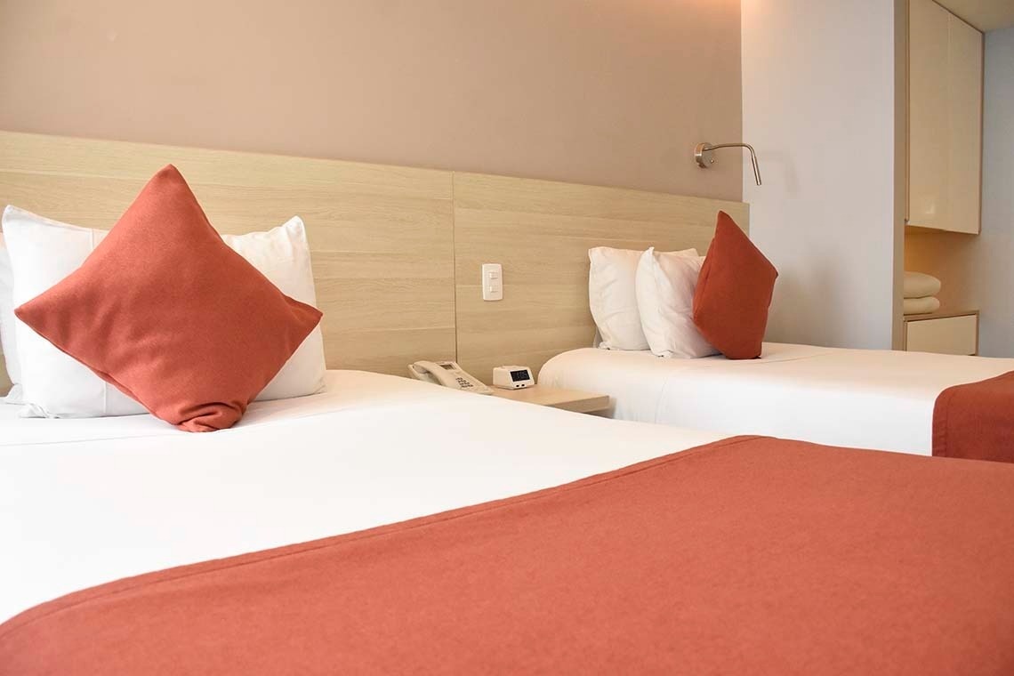 Pleasant and spacious room, it is the largest in the Hotel with 32 m², internal view, its accommodation allows for 1 King bed or two semi-double beds, electronic lock with proximity opening system, thermoacoustic windows, central air conditioning with individual thermostat, double closet, central water heating system, FREE Wi-Fi Internet, bathroom, mini-fridge, TV, digital safe, clock radio with Bluetooth and USB port.